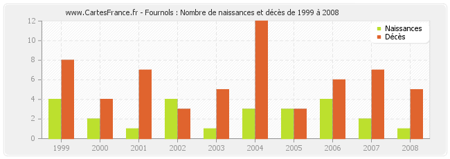 Fournols : évolution des naissances et décès de 1968 à 2007