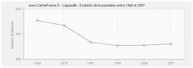 La population de Laqueuille était de 392 habitants en 2007, 384 habitants en 1999, 382 habitants en 1990, 402 habitants en 1982, 502 habitants en 1975 et 531 habitants en 1968.