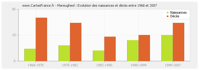 Mareugheol : évolution des naissances et décès de 1968 à 2007