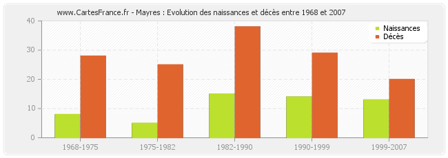 Mayres : évolution des naissances et décès de 1968 à 2007