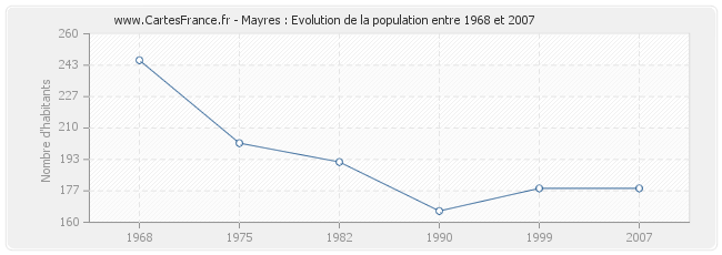 La population de Mayres était de 178 habitants en 2007, 178 habitants en 1999, 166 habitants en 1990, 192 habitants en 1982, 202 habitants en 1975 et 246 habitants en 1968.