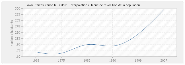 Cette courbe reprend l'historique de la population d'Olloix de 1968 à 2007 en interpolation cubique. Ceci permet d'obtenir plus précisément la population de la commune d'Olloix les années ou aucun recensement n'a été effectué.