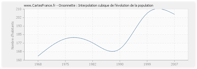 Cette courbe reprend l'historique de la population d'Orsonnette de 1968 à 2007 en interpolation cubique. Ceci permet d'obtenir plus précisément la population de la commune d'Orsonnette les années ou aucun recensement n'a été effectué.