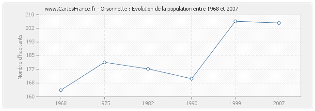 La population d'Orsonnette était de 205 habitants en 2007, 206 habitants en 1999, 171 habitants en 1990, 177 habitants en 1982, 181 habitants en 1975 et 164 habitants en 1968.