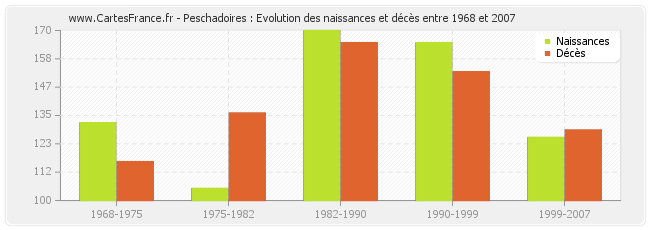 Peschadoires : évolution des naissances et décès de 1968 à 2007