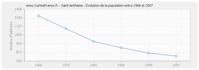 La population de Saint-Anthème était de 768 habitants en 2007, 807 habitants en 1999, 880 habitants en 1990, 966 habitants en 1982, 1 137 habitants en 1975 et 1 313 habitants en 1968.