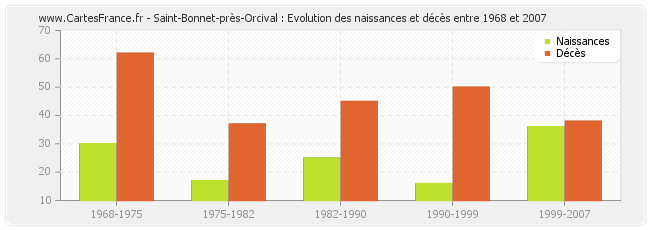 Saint-Bonnet-près-Orcival : évolution des naissances et décès de 1968 à 2007