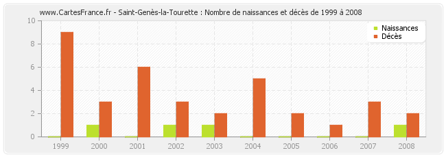- Saint-Genès-la-Tourette en 2008 : 1 naissances et 2 décès