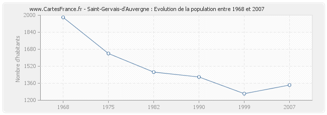 La population de Saint-Gervais-d'Auvergne était de 1 343 habitants en 2007, 1 262 habitants en 1999, 1 419 habitants en 1990, 1 465 habitants en 1982, 1 640 habitants en 1975 et 1 980 habitants en 1968.