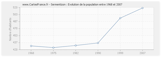 La population de Sermentizon était de 519 habitants en 2007, 495 habitants en 1999, 436 habitants en 1990, 430 habitants en 1982, 425 habitants en 1975 et 429 habitants en 1968.