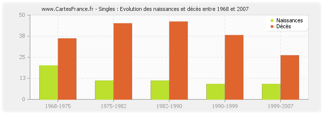 La population de Singles était de 192 habitants en 2007, 211 habitants en 1999, 214 habitants en 1990, 265 habitants en 1982, 321 habitants en 1975 et 342 habitants en 1968.