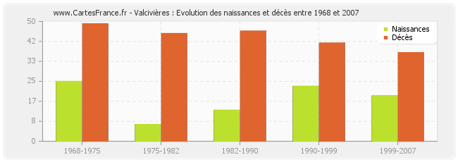 Valcivières : évolution des naissances et décès de 1968 à 2007