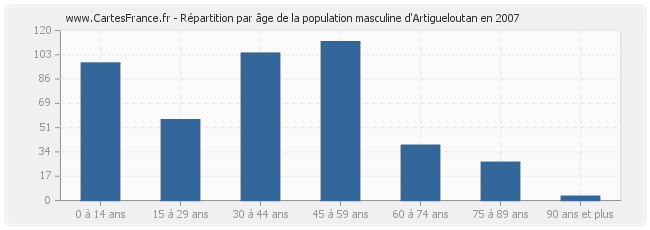 - Hommes de 0 à 14 ans habitant Artigueloutan : 97
