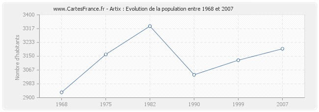 Cette courbe reprend l'historique de la population d'Artix de 1968 à 2007 en interpolation cubique. Ceci permet d'obtenir plus précisément la population de la commune d'Artix les années ou aucun recensement n'a été effectué.