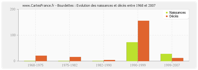 Bourdettes : évolution des naissances et décès de 1968 à 2007