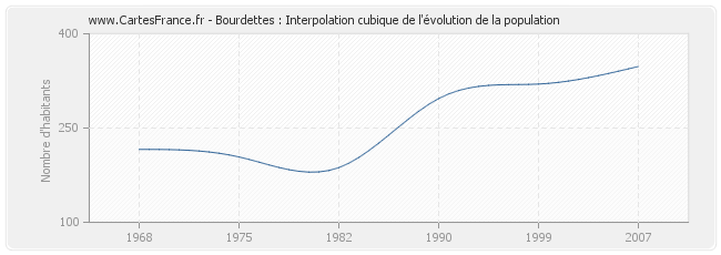 Cette courbe reprend l'historique de la population de Bourdettes de 1968 à 2007 en interpolation cubique. Ceci permet d'obtenir plus précisément la population de la commune de Bourdettes les années ou aucun recensement n'a été effectué.