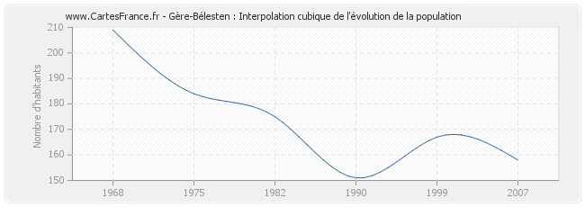 Cette courbe reprend l'historique de la population de Gère-Bélesten de 1968 à 2007 en interpolation cubique. Ceci permet d'obtenir plus précisément la population de la commune de Gère-Bélesten les années ou aucun recensement n'a été effectué.
