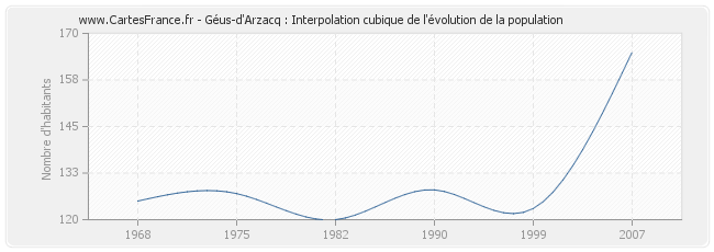 Cette courbe reprend l'historique de la population de Géus-d'Arzacq de 1968 à 2007 en interpolation cubique. Ceci permet d'obtenir plus précisément la population de la commune de Géus-d'Arzacq les années ou aucun recensement n'a été effectué.