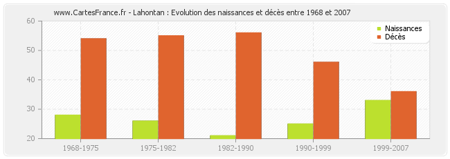 Lahontan : évolution des naissances et décès de 1968 à 2007