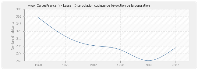 Cette courbe reprend l'historique de la population de Lasse de 1968 à 2007 en interpolation cubique. Ceci permet d'obtenir plus précisément la population de la commune de Lasse les années ou aucun recensement n'a été effectué.