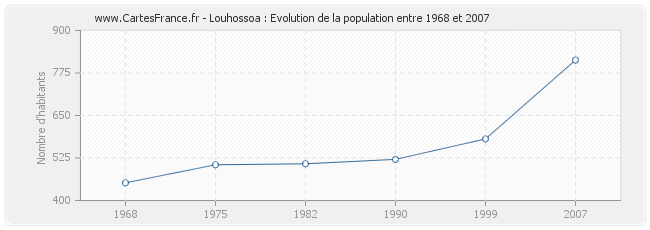 Cette courbe reprend l'historique de la population de Louhossoa de 1968 à 2007 en interpolation cubique. Ceci permet d'obtenir plus précisément la population de la commune de Louhossoa les années ou aucun recensement n'a été effectué.