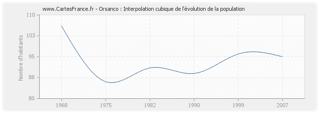 Cette courbe reprend l'historique de la population d'Orsanco de 1968 à 2007 en interpolation cubique. Ceci permet d'obtenir plus précisément la population de la commune d'Orsanco les années ou aucun recensement n'a été effectué.