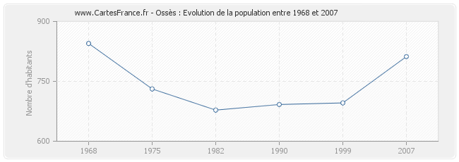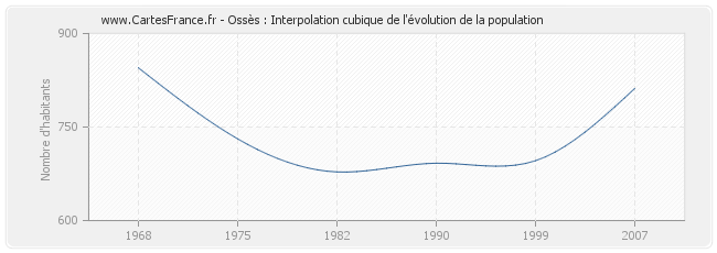 Cette courbe reprend l'historique de la population d'Ossès de 1968 à 2007 en interpolation cubique. Ceci permet d'obtenir plus précisément la population de la commune d'Ossès les années ou aucun recensement n'a été effectué.