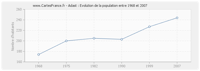 La population d'Adast était de 244 habitants en 2007, 227 habitants en 1999, 203 habitants en 1990, 205 habitants en 1982, 200 habitants en 1975 et 174 habitants en 1968.