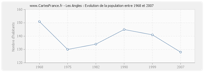 La population de Les Angles était de 128 habitants en 2007, 141 habitants en 1999, 145 habitants en 1990, 134 habitants en 1982, 130 habitants en 1975 et 151 habitants en 1968.
