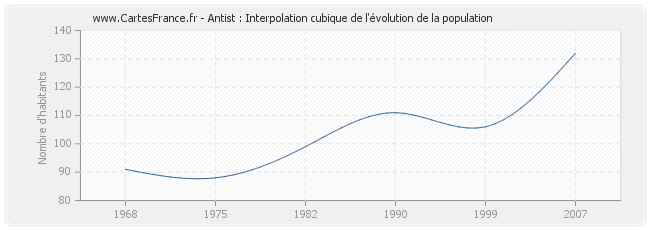 Cette courbe reprend l'historique de la population d'Antist de 1968 à 2007 en interpolation cubique. Ceci permet d'obtenir plus précisément la population de la commune d'Antist les années ou aucun recensement n'a été effectué.