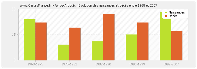 Ayros-Arbouix : évolution des naissances et décès de 1968 à 2007