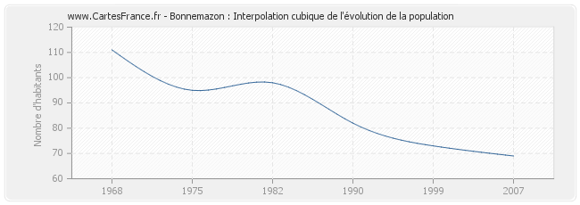 Cette courbe reprend l'historique de la population de Bonnemazon de 1968 à 2007 en interpolation cubique. Ceci permet d'obtenir plus précisément la population de la commune de Bonnemazon les années ou aucun recensement n'a été effectué.