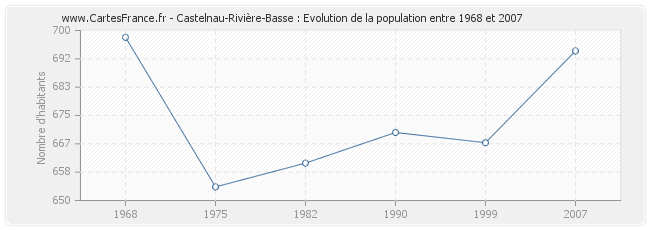 La population de Castelnau-Rivière-Basse était de 694 habitants en 2007, 667 habitants en 1999, 670 habitants en 1990, 661 habitants en 1982, 654 habitants en 1975 et 698 habitants en 1968.