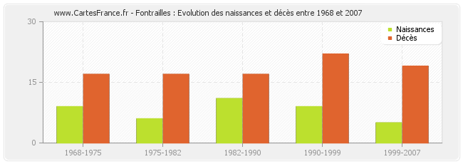 Fontrailles : évolution des naissances et décès de 1968 à 2007