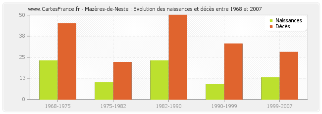 Mazères-de-Neste : évolution des naissances et décès de 1968 à 2007
