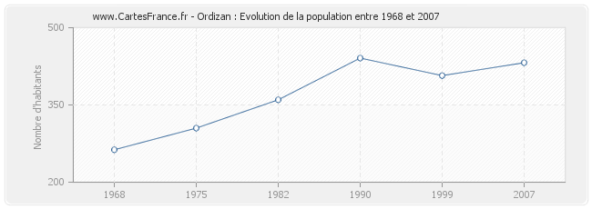 Cette courbe reprend l'historique de la population d'Ordizan de 1968 à 2007 en interpolation cubique. Ceci permet d'obtenir plus précisément la population de la commune d'Ordizan les années ou aucun recensement n'a été effectué.