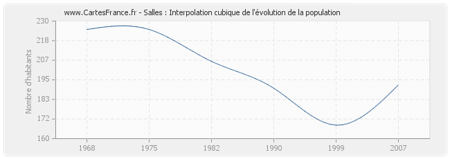 Cette courbe reprend l'historique de la population de Salles de 1968 à 2007 en interpolation cubique. Ceci permet d'obtenir plus précisément la population de la commune de Salles les années ou aucun recensement n'a été effectué.