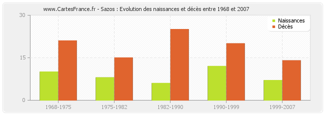 Sazos : évolution des naissances et décès de 1968 à 2007