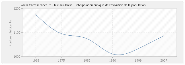 Cette courbe reprend l'historique de la population de Trie-sur-Baïse de 1968 à 2007 en interpolation cubique. Ceci permet d'obtenir plus précisément la population de la commune de Trie-sur-Baïse les années ou aucun recensement n'a été effectué.