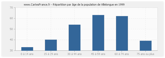 - Population de Villelongue de 45 à 59 ans : 63 habitants