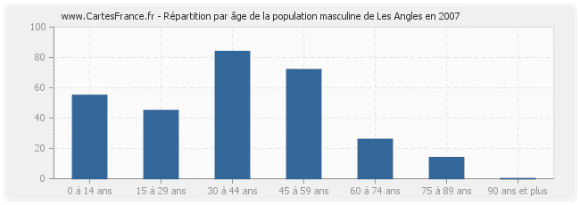 Répartition de la population masculine de Les Angles par âge en 2007 :