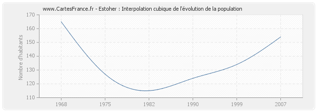 Cette courbe reprend l'historique de la population d'Estoher de 1968 à 2007 en interpolation cubique. Ceci permet d'obtenir plus précisément la population de la commune d'Estoher les années ou aucun recensement n'a été effectué.