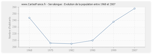 La population de Serralongue était de 258 habitants en 2007, 238 habitants en 1999, 210 habitants en 1990, 205 habitants en 1982, 206 habitants en 1975 et 244 habitants en 1968.
