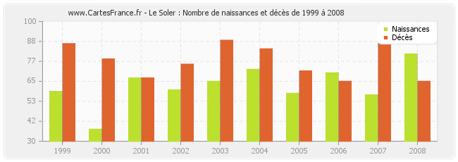 - Le Soler en 2008 : 81 naissances et 65 décès