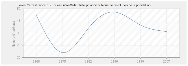 Cette courbe reprend l'historique de la population de Thuès-Entre-Valls de 1968 à 2007 en interpolation cubique. Ceci permet d'obtenir plus précisément la population de la commune de Thuès-Entre-Valls les années ou aucun recensement n'a été effectué.