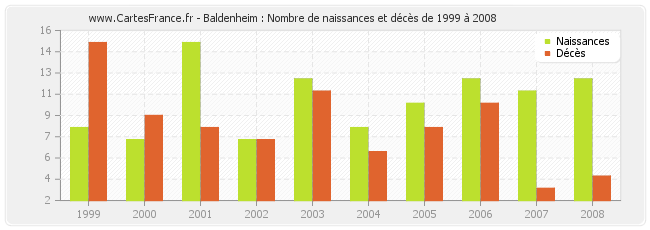- Baldenheim en 2008 : 12 naissances et 4 décès