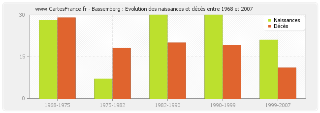 Bassemberg : évolution des naissances et décès de 1968 à 2007