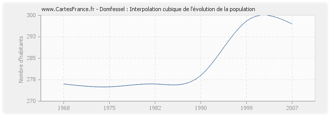 Cette courbe reprend l'historique de la population de Domfessel de 1968 à 2007 en interpolation cubique. Ceci permet d'obtenir plus précisément la population de la commune de Domfessel les années ou aucun recensement n'a été effectué.
