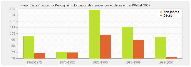 Duppigheim : évolution des naissances et décès de 1968 à 2007