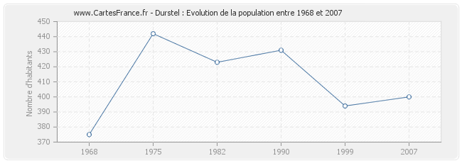 La population de Durstel était de 400 habitants en 2007, 394 habitants en 1999, 431 habitants en 1990, 423 habitants en 1982, 442 habitants en 1975 et 375 habitants en 1968.